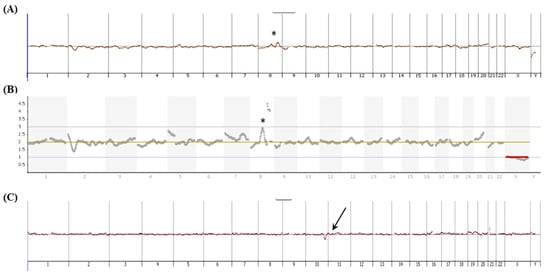 For SK-BR-3 cells, both aCGH and NGS analyses were performed, and the recognizable genomic features of the SK-BR-3 cell line [42] were identified (Figure 7A,B). For the four prenatal cases with de novo pathogenic copy number changes (cases 1–4 in Table 2), aCGH were performed and the results are consistent with the fetal genetic features pre-acquired by aCGH of amniotic fluid. An exemplified aCGH result for the captured fnRBCs (case 2 in Table 2) is showed in Figure 7C.