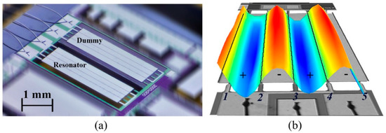 (a) Top-view micrograph of the resonator (3000 μm × 900 μm × 10 μm) and compensation device in a dual in-line package. (b) Modal shape measured with a laser Doppler vibrometer (05-mode).