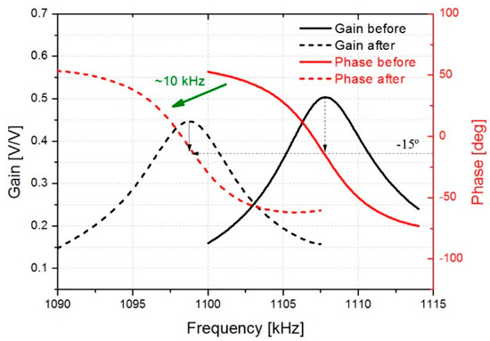 Open loop response of the interface circuit for the 05-mode. Gain-phase before represents the initial state of the resonator in air, and gain-phase after indicates the final state after the deposition of cigarette particles.