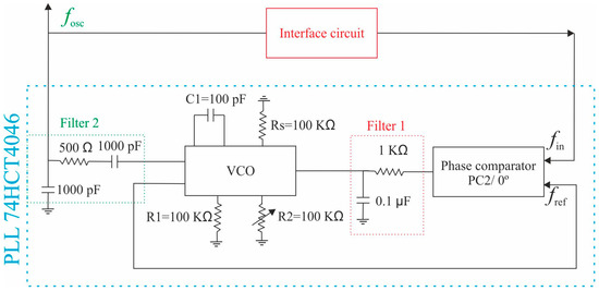 In the previous section, we could check that the open-loop technique presents a poor frequency resolution. In addition, this technique requires a long measurement time, limiting the potential application in a real-time monitoring system. For this reason, a low-cost PLL-based oscillator circuit, utilizing the previously described 74HCT4046, was developed.