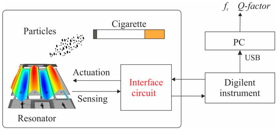 Initially, the 05-mode was analyzed with an open-loop technique based on a USB data acquisition board, Digilent instrument Analog Discovery 2 (Digilent Inc., Pullman, WA, USA) [32], capable of performing sweep frequency measurements. This instrument is connected to a PC in order to calculate fr and Q-factor of the resonator since these parameters have a large influence on the sensitivity and efficiency of the mass concentration sensing principle. A schematic of the setup along with the interface circuit is presented in Figure 5. The sensor is separated by a distance of 10 cm from the cigarette. This prevents larger particles from depositing directly on the resonator surface. In addition, the sensor is located on the same printed circuit board (PCB) next to the interface circuit.