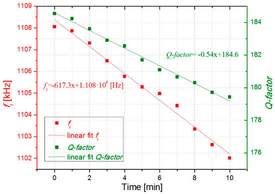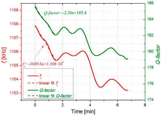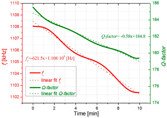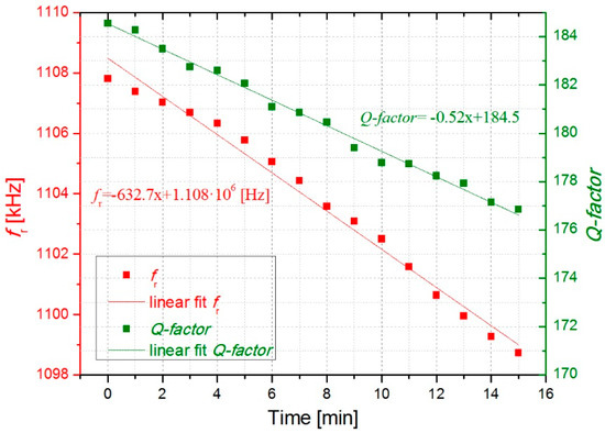 In Figure 6 and Figure 7, the open-loop measurements are displayed showing the evolution of the resonant parameters with the deposition of cigarette particles. As expected from the previous results, fr and Q-factor decreased over time due to a higher concentration of cigarette particles on the surface resonator. More deposited cigarette particles result in higher frequency shifts. As it can be observed in Figure 6 and Figure 7, an almost linear decrease occurs for fr and Q-factor obtaining a decrease of around 625 ± 8 Hz/min and −0.55 ± 0.03 min−1, respectively.