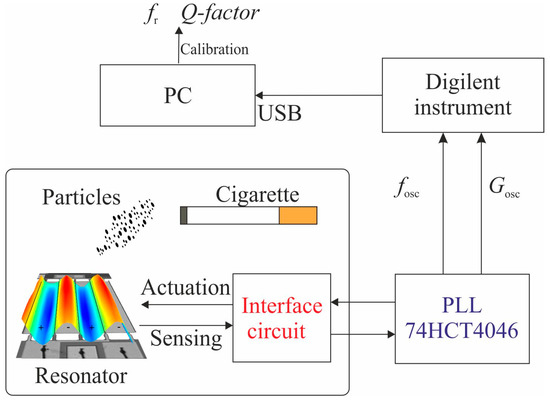 In conclusion, the development of a closed-loop circuit setup based on a piezoelectric micro-plate resonator and the integrated circuit 74HCT4046 has been demonstrated. The system is capable of tracking the resonance frequency and quality factor of the device, oscillating in a high order vibrational mode (05-mode), with a sensitivity of 8.8 Hz/ng and a resolution of 114 pg. In this case, the mass-loading effect tests were proven by collecting particles from a cigarette. Nevertheless, the results obtained in this application may have potential applications for the detection of nanoparticles in a workplace environment.