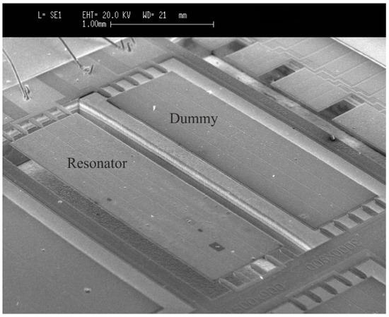 The resonant parameters change due to external environmental influences on the device and need to be determined in real-time. The detection of these parameters can be performed using several methods [4,26,27]. The real-time monitoring of the resonant parameters may be challenging due to the low-quality factors and parasitic effects present in the resonator [12,28]. For this reason, an interface circuit based on resonators in two-port configuration involving a parasitic compensation device and an instrumentation amplifier was used to cancel the parasitic effects (see Figure 2). However, our results show that a capacitive crosstalk across the actuation and sensing ports has a significant contribution to the output current. To minimize this parasitic component, a compensation (dummy) device was introduced [23]. This additional device duplicates the structure of the resonator, being basically an exact copy of the plate resonator, unreleased to prevent its vibration. As it can be observed in Figure 3, the application of the interface circuit results in a clear resonance, with low baseline and the necessary phase to meet the Barkhausen criterion for oscillation.