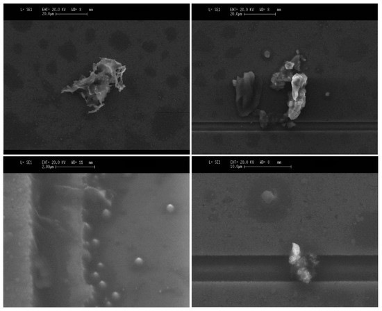 Micrographs of different cigarette particles deposited on the surfaces of a piezoelectric resonator.