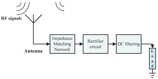 The typical RF energy harvesting structure includes three main parts: the antenna, impedance matching circuit and rectifier circuit. In an RF energy harvesting system, the radiated RF signals from a transmitter station are captured by the antenna and converted into alternating current (AC) voltage. The matching circuit composed of inductor–capacitor (LC) components needs to be 50-Ω matched to ensure for maximum power transferal to the matched rectifier. The rectifying circuit converts AC voltage into direct current (DC) voltage to the attached application load. However, the omnipresent RF energy has low power density at a few μW []. The general structure of an RF energy harvesting system with a low-input-power setup is shown in Figure 1.