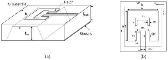 One possible approach to improve these parameters is by implementing silicon (Si) technology, which was already established many years ago. Si-based microfabrication in micro-electromechanical system (MEMS) technology has shown excellent potential for the formation of highly efficient sensors, and is contributing to the enhancement of various RF antennas and devices []. However, the high permittivity of Si substrates lowers antenna performance []. Some other applications of Si based in RF, such as Si-based MEMS reconfigurable antennas and devices, have been reported in [,], showing the high potential of the Si technology in RF circuit applications at different frequency bands.
