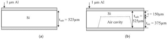 This process involves the etching of a portion of Si or glass substrate to create an air cavity between the substrate and ground plane electrodes, as illustrated in Figure 3b. Here, a 525-µm-thick Si substrate is anisotropically etched to create a cavity with a depth of 375 µm. Wet chemical etching by potassium hydroxide (KOH) etchant liquid is used in the process, while 1-µm-thick Al is sputtered at the top side of the substrate. The geometric layout of the radiator patch antenna is then patterned by a photolithography process on the top layer of the Si substrate, followed by a metal etch process. Underneath the Si substrate, a sputtered Al layer with the support of a hard transparent plastic sheet is attached to the silicon substrate as a metal ground plane.
