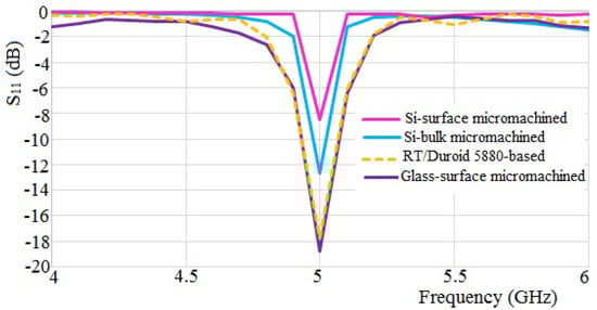 The obtained simulated return loss results are plotted in Figure 4. From the simulation, it is shown that the return loss S11 parameter is less than −10 dB for all apart from the Si-surface micromachined antenna, which is due to the high εr. The S11 parameter below −10 dB indicates the range where the antenna can operate properly.