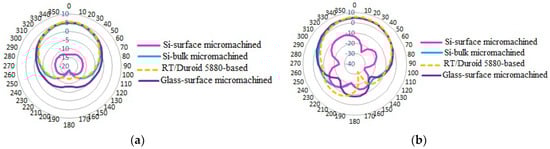 The simulated E and H planes of 2D far-field radiation patterns of the antennas are shown in Figure 5. In the E-plane, the antennas show a linear top symmetrical and omnidirectional beam pattern. In the H-plane, the Si-surface micromachined antenna shows a nonhomogeneous minor radiation pattern, and the other three antennas show a top omnidirectional beam pattern. It can be observed that there is a major radiation pattern at the top side of both E and H planes. Thus, these antennas are focused for the radiation beam from the top radiator patch.