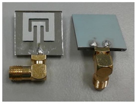The surface micromachining is the process method to create an electromechanical structure on the surface of the substrate [,]. Here, the Si or glass substrate materials are fabricated using a surface micromachining method, in which the antenna pattern is fabricated on top of the substrate surface. The side views of the structures are illustrated in Figure 3a,c.