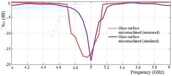 Further investigation is conducted by replacing the Si-based-surface micromachined antenna substrate with glass. Here, the glass substrate is selected because of its low εr. The results show that the S11 parameter of the glass-surface micromachined antenna is increased by 55.1% compared to the Si-surface micromachined antenna. The antenna comparison with the conventional PCB RT/Duroid 5880-based antenna shows that the S11 parameter of the glass-surface micromachined antenna improves by 5.6%.