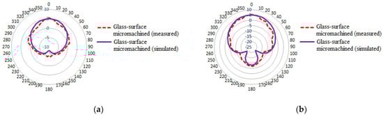 Comparison of measured and simulated far-field radiation patterns of glass-based-surface micromachined antenna: (a) E-field (y–z plane); (b) H-field (x–z plane).