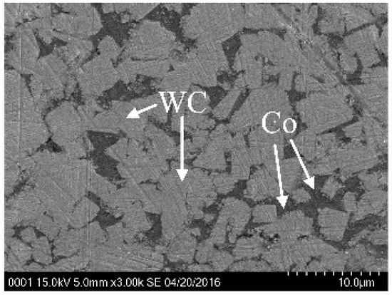 The commercial cemented carbide WC-15Co was adopted as the workpiece material. With superior mechanical properties of high strength, good toughness, and sufficient wear resistance, it is widely used as stamping molds and extrusion molds in mass production. The large cutting force, excessive tool wear, and bad surface quality are the main problems that are faced in the micromilling process. The micrograph of used cemented carbide is shown in Figure 1. The average size of WC grains was about 4–6 μm. The cemented carbide material properties are listed in Table 1.
