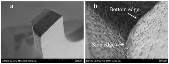 A single flute PCD micro end mill that is prepared by wire electrical discharge machining (WEDM) was employed for the experiments, as shown in Figure 2. The tool diameter was 0.7 mm. It is expected to reduce the tool flection with the small ratio of length to diameter during micromilling. Therefore, the tool length was designed to be 0.5 mm. The tool tip radius was about 20 μm. The tool’s geometric accuracy of the same batch is ±1 μm. The bottom cutting edge presented an inclination angle of 10°, rake angle of 0°, and flank angle of 10°. The cutting edge radius was measured using Leica DVM500 microscope (Leica Microsystems, Buffalo Grove, IL, USA) to about 3 μm.