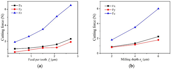 The effect of machining parameters on cutting force. (a) Cutting force versus feed rate (ap = 4 μm). (b) Cutting force versus milling depth (fz = 1.5 μm).