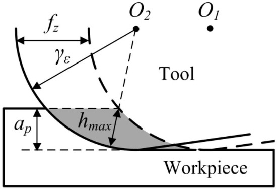 The instantaneous uncut chip thickness gradually grows from the bottom of the tool tip arc and reaches the maximum at the intersection point of the cutting edge and material surface. Through geometric calculation, the maximum uncut chip thickness hmax is derived with the formula listed below: