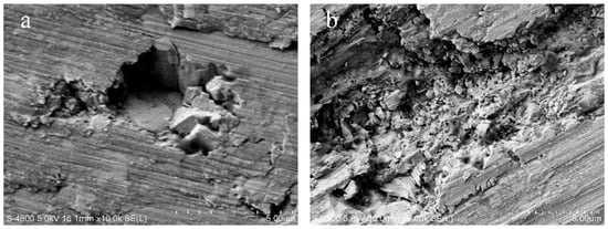 From the above formula, when fz = 2.7 μm, the maximum uncut chip thickness hmax reaches 1.5 μm and exceeds the critical uncut chip thickness dc. Thus, the brittle damages are exhibited on the surface morphology and greatly deteriorated the surface quality, as shown in Figure 5c. The typical brittle damages on the surface morphology are shown in Figure 7. When brittle fracture occurs, the WC particle is broken into several pieces, forming brittle cracks in itself. The broken pieces that are exposed on the machined surface are loose because they are not held by the binding phase. Then, these broken pieces fall off and the micro-pit is formed on the surface morphology, as shown in Figure 7a. The broken pieces under the machined surface are held by the binding phase and remained in micro-pit. The brittle cracks and broken pieces are still visible on the bottom of the micro-pit. Figure 7b shows that the whole WC particle is severely broken into very fine fragments. Almost all the fine fragments are dropping out and the larger pit is generated. The micro-pits and cracks greatly affect the surface quality and usually cause great surface roughness.