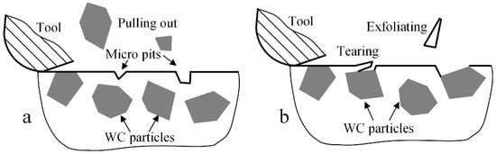 As a multiphase material, there are also some non-cutting behaviors that affect the surface quality. As shown in Figure 8a, if there is only a small segment of WC particle left on the machined surface during the tool cutting process, it may rotate and be pulled out from the surface due to the insufficient binding strength. The pulling of the WC particle can cause a micro-pit on the surface morphology. As shown in Figure 8b, if the binding phase becomes very thin during the tool cutting process, the binding phase may tear and then exfoliate due to the severe plowing. The tearing and exfoliating behaviors can cause micro burrs or pits on the surface morphology. This surface damage mechanism may occur both in the ductile and brittle cutting.
