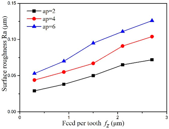 Figure 5 shows the surface morphology with different feed per tooth. When fz = 0.3 μm, the surface morphology characteristic exhibits regular and smooth cutting marks without any brittle damages. The surface textures confirm the material removal mode is plastic deformation, just like in the case of the machining of plastic metal. Some scale-stab can be observed on the surface morphology as well. Due to the fact that the feed per tooth is much lower than the cutting edge radius, the effective rake angle is actually large negative value. The severe plowing becomes important during the milling process. The cutting force signal also reflects the notable plowing phenomenon. Some plastic deformed material is bonded and accumulated under the cutting edge arc due to the plowing. When the accumulated material falls off, some of them will then adhere to the machined surface and form a micro scale-stab. Moreover, the small feed per tooth is comparable to the minimum uncut thickness. Some material that failed to form chips due to the minimum uncut thickness phenomenon also form a micro scale-stab on the machined surface [33].