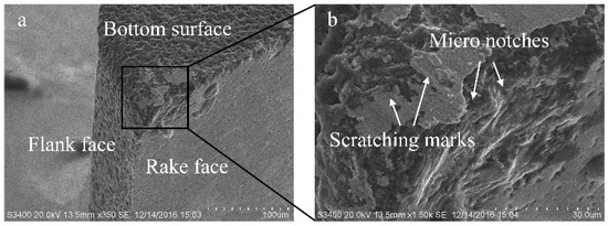 The wearing concave is the main wear characteristic on the rake face. However, there are no obvious scratching marks or adhesions on the rake face. It is indicated that the abrasive or adhesive wear are not the main wear mechanisms on the rake face. The exfoliation is assumed to be the possible wear mechanism on the rake face. In micromilling of cemented carbide, the chips are powder sharp and include hard WC fragments. When these hard chips flow out along the rake face, they seriously damage the rake face at the same time. This behavior is sustained throughout the whole machining process and results in a serious mechanical crash on the rake face as well. Some microelectrical erosion defects that were generated in the WEDM process exist on the rake face. In addition, microchipping on the cutting edge may also induce some microcracks that propagate on the rake face. Under the serious mechanical crash, these microdefects gradually develop into material exfoliation on the rake face. The exfoliating behavior causes a large piece of PCD material to drop from the tool body. Because the serious mechanical crash that was induced by the hard chips is only focused on the bottom of the rake face, the exfoliating pits are mainly formed on the bottom of rake face as well, as shown in Figure 10b.