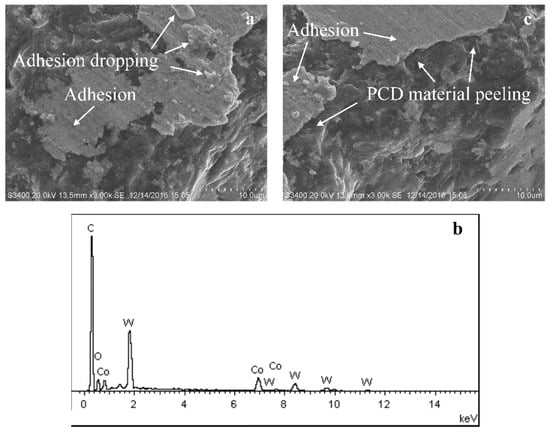 The scratching marks are clear to see on the bottom face. This indicates the severe abrasive wear during the micromilling process due to the high hardness of cemented carbide. Moreover, there are many visible adhesions on the bottom surface, as shown in Figure 11a. It is just like the state of the machining process of plastic metal. These adhesions are identified to be cemented carbide material which is in a serious plastic deformation state, based on the energy dispersive spectrometer (EDS) results in Figure 11b. This illustrates that the hard and brittle material is removed with ductile cutting during micromilling as well. From the cutting force results, it can be seen that the axial force component is very large. Because the machining parameters are only several microns, the axial force load is concentrated on the cutting region of only a few square microns. This generates very high cutting stress on the bottom surface. Cemented carbide material is adhered and embedded into the tool surface under the high cutting stress. With the accumulation of adhesive material, the adhesive layer becomes the bulgy part on the tool surface. The bulgy adhesive layer suffers severe friction and a high-frequency of attacks. This leads to some adhesions fracturing and falling from the tool body. Meanwhile, some diamond particles also peel from the tool surface and form a rough region on the tool surface, as shown in Figure 11c. Then, the new adhesive layer will generate and the adhesive wear process will occur again. The severe adhesive wear is the dominant wear mechanism on the bottom surface.
