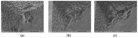 With a continuous milling process, more and more material has been removed, and the tool wear is gradually increasing as well. Figure 12 shows the PCD tool wear process varying with material removal volume V. Although only a 0.4 mm3 volume of cemented carbide is removed, a large wear area appeared on the rake face; however, there is just slight wear on the bottom surface. In the early stage, due to the electrical erosion defects on the tool surface, the tool wear behaviors are mainly microchipping on the cutting edge and exfoliating on the rake face. After the electrical erosion pits have disappeared, these two kinds of tool wear behaviors are reduced and become minor. With the increase of the material removal volume to 1.6 mm3, the wear area on the rake face has increased little. However, the bottom surface wear is obvious due to its large increase, as shown in Figure 12b. The severe abrasive and adhesive wear behaviors are dominant at this stage with the increasing contact between the bottom surface and workpiece. When the material removal volume reaches 3.2 mm3, tool wear is very serious both on the rake face and bottom surface, as shown in Figure 12c. The extrusion and friction between the worn tool and workpiece are rising rapidly. This results in the adhesive wear process becoming more notable.