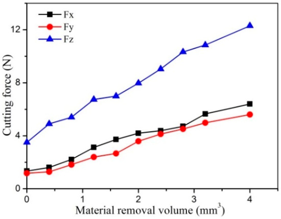 The cutting force variation as a function of the material removal volume is shown in Figure 13. It is seen that the cutting force almost linearly grows with the material removal volume. Respectively, the normal force Fx, feed force Fy, and axial force Fz grows from 1.3 N, 1.2 N, and 3.5 N to 6.4 N, 5.6 N, and 12.3 N, respectively, after removing cemented carbide with a volume of 4 mm3. They have increased almost four times due to severe tool wear. The large cutting force can greatly increase the flection deformation and breakage risk of the PCD tool due to its small diameter and low strength.