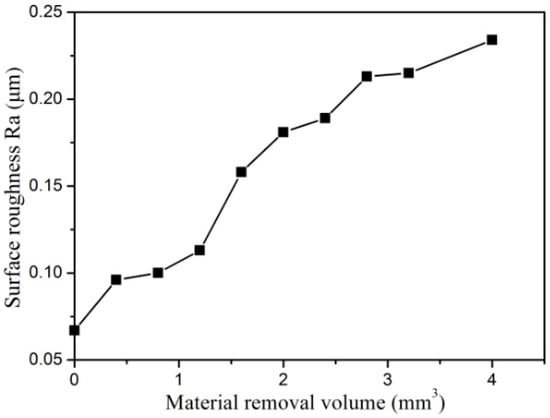 Figure 14 shows that the surface roughness increases with the material removal volume as well. When the PCD tool is fresh and sharp, the surface roughness is very low, at about 0.07 μm. After 4 mm3 of cemented carbide was removed, the PCD tool was sufficiently worn to become blunt, and the surface roughness increased to 0.24 μm. The surface quality severely deteriorated with the tool wear. This indicates that the PCD tool is invalid and unsuitable for continuous machining.