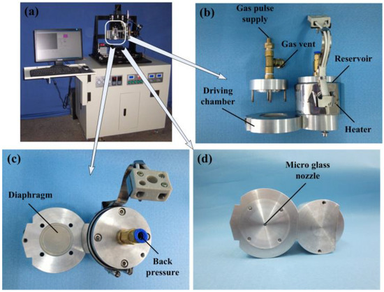 Figure 1 shows photos of drop-on-demand microjetting system and pneumatic diaphragm microdroplet actuator. The actuator consists of a reservoir, a pneumatic chamber connecting with a solenoid valve, a driving chamber separated by a diaphragm made of stainless steel, and a microglass nozzle. When a voltage pulse is applied to the solenoid valve, the generated pneumatic pressure pulse will act on the diaphragm. Then, the diaphragm will bend and its deformation will push a certain amount of liquid out of the nozzle and form the microdroplet.