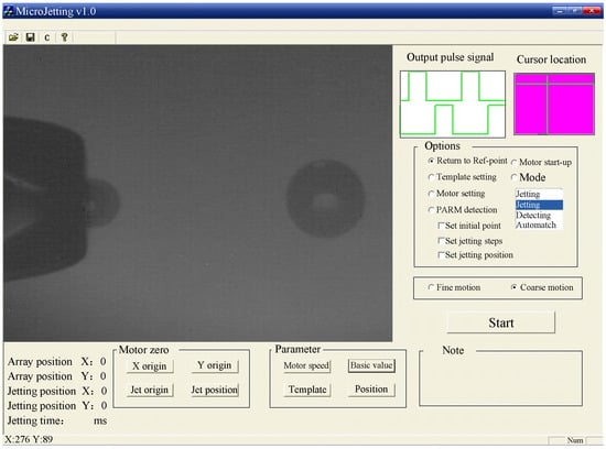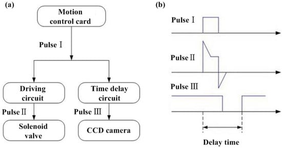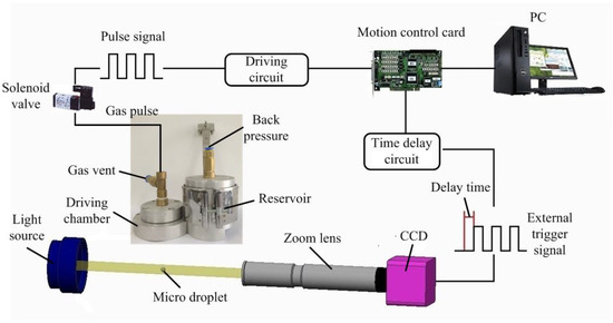 In recent years, the emergence of stroboscopic technique provided an effective approach to record microjetting. Along with this technology was put forward, many image acquisition systems of microdroplets based on delay triggering have been proposed, and their components and features are illustrated in Table 1. Dong et al. [5] described a visualizing apparatus based on flash photography including a pulsed laser, a charge-coupled camera, and signal generators. Sharp images with sufficient temporal resolution had been obtained. Hutchings et al. [6] described a technique which had been developed for analyzing the shape and development of ink jets and drops. Kwon et al. [7] proposed an image measurement system to observe and analyze the image of the droplet. The components were the multifunction I/O unit, a strobe light-emitting diode (LED) light and a charge-coupled device (CCD). The two counters in multifunction I/O unit could generate two digital pulse trains. The first digital pulse was to stimulate the waveform for the jetting. The second was used as a trigger signal for controlling a strobe LED light which was synchronized with the signal used to produce the ink jet. By adjusting the delay time, the microdrop formation process could be obtained. The in situ measurement system built by Fan et al. [8] was composed of a CCD camera, a zoom lens, and a stroboscopic light. The strobe light was simultaneously triggered by the same frequency as the function generator which actuated the piezoelectric ceramic film. By selecting a proper shutter speed, a steady image of the droplet could clearly be viewed and captured by the camera. Jo et al. [9] also employed the stroboscopic method to get the pictures of drop deformation by changing the delay time between the pulse inception and the flash of LED light. The precise real-time measurement technology proposed by Thurow et al. [10] was implemented in most appliances with the aid of a stroboscope camera system. The hardware was made up of a camera with an enlarging lens and a LED stroboscope. In the international standards of IEC 62899-302-1:2017 Printed electronics Part 302-1 and IEC 62899-302-2:2018 Printed electronics Part 302-2, the imaging based measurement of jetted drop speeds and drop volume was described [11,12]. By means of the above techniques, the speed and diameter of the microdroplet could be calculated based on the CCD camera image and the delay time [13,14,15]. Martin et al. published analysis of inkjet droplet image processing techniques and errors [16,17]. Laser holographic methods in 3D are described by Martin et al. [18] Hsiao et al. has published imaging work on solder balls [19]. Jung described a high-speed imaging which was used to analyze the impact and spreading the drops onto smooth glass surfaces [20]. Jiang et al. used a low-cost microcontroller board (typical cost is less than a hundred US dollars) as the pulse generator in a flash photographic system [21]. Martin et al. also described the measurement of the volumes of small (10–100 µm) liquid drops is important in a number of fields including inkjet printing, liquid dispensing, and spraying [22].