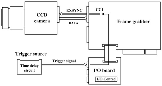 For the CCD camera, a Photonfocus MV-D750E with resolution of 1024 × 760 pixels is used. The camera includes free running and external trigger mode. When the acquisition of an image needs to be synchronized to an external event, a trigger mode can be used. As seen in Figure 3, camera control signals (CC-signals) can be defined by the camera manufacturer to provide certain signals to the camera. There are four CC-signals available and are all unidirectional with data flowing from the frame grabber to the camera. For example, the external trigger is provided by a CC-signal.