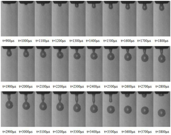 Time-lapse images of microdroplet generation can be easily acquired by the in situ imaging system. When setting the minimal interval time step as 100 μs, though adjusting the variable resistance in the time delay circuit, we can get the combination pictures of the ejecting process by adjusting the interval from 0 to 5000 μs or more. In our experiment, 50 samples of the microdroplet are captured and evaluated at each moment. And 5 sets of sequence diagram are obtained to illustrate the flight and formation process of microdroplets, as the Supplementary Materials shown. Figure 7 describes the time-lapse images of microdroplet generation with one primary droplet. The solution is glycerin/water (60:40, mass ratio). The viscosity and surface tension are 10 MPa·s and 69 mN/m, respectively. When the driving pressure was 0.39 Mpa, the time of high level for input pulse was 1.7 ms and the operating frequency was 2 Hz; the ejecting process from 900 μs to 3800 μs is shown in Figure 7. It can be clearly seen the steps of ejection, elongation, necking, breakup, oscillation, and formation; only one primary droplet came into being under these conditions. Since the ejected trajectory can be captured, the droplet diameters and velocities can be measured from these pictures through the method of image processing.