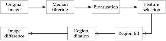 The three characteristics of the median filter method are exactly in line with the requirements of “protecting the edge of the target image and eliminating salt-and-pepper noise”. The image preprocessing achieved good results. Subsequently, in order to further the contrast between the droplet and the background, a grayscale linear transformation was performed on the median-filtered picture. Finally, the small area where the droplets are located is obtained by means of threshold segmentation, feature extraction, and morphology.