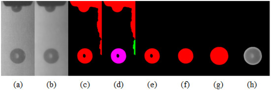 Droplet image preprocessing. (a) original image, (b) median filter, (c) binarization, (d) connection, (e) feature selection, (f) region fill, (g) region dilation, and (h) image difference.