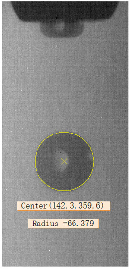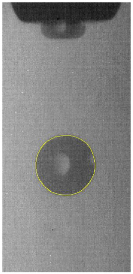 Since the image was acquired under steady-state conditions, the droplets gradually became stable during the flight until a standard sphere was formed (assuming the droplets were flying far enough). Therefore, the outline of the droplets in the steady state is approximately circular. If the contour of the droplet extracted in Section 4.2 has a roundness of 0.98 or more, it can be considered that the droplet under this condition is in a stable state, and that its morphology can be approximated as a standard sphere. However, due to the presence of the reflective surface of the droplet and the presence of salt-and-pepper noise, the extracted edges are not smooth. In order to facilitate the calculation of the liquid volume and the accuracy of the edge extraction, the shape of the sub-pixel edge obtained above is fitted. A circle-fit image of the droplet profile as shown in Figure 11 was obtained.