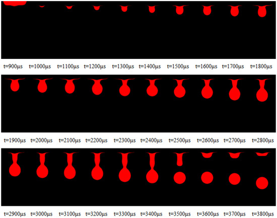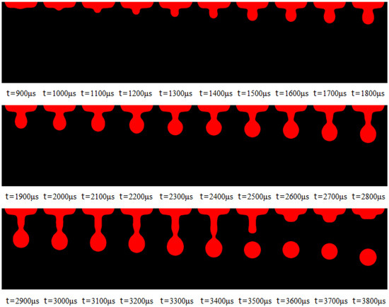 When t = 3500 μs, there are two barycentric coordinates and, meanwhile, only one droplet is formed. When calculating the velocity of the droplet at this moment, the generated droplet and the liquid column below the nozzle are regarded as a whole; the reference point is calculated using the overall center of barycentric coordinate as the velocity.