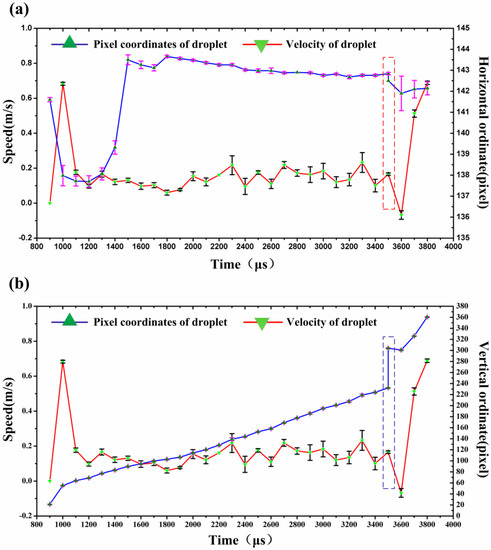 According to Table 3, a line chart of average velocity, average abscissa, and ordinate varying with time can be plotted. In addition, in order to reflect the droplet barycentric coordinates (pixel coordinates, including horizontal and longitudinal coordinates) and the fluctuation size of velocity at each moment more clearly, the error bars of velocity, horizontal, and longitudinal coordinates are obtained according to Table 3 and are shown in Figure 16. The technique has higher accuracy compared with the method of calculating velocity with the microdroplet terminal coordinate as the reference point.