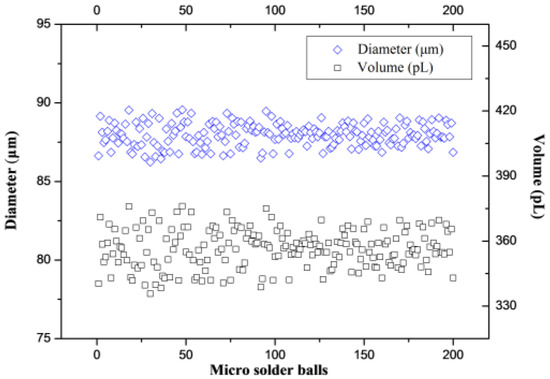 The pneumatically diaphragm-driven actuator is also applied to generate microsolder balls. The solder brand is 63/37, with 63% tin and 37% lead. The melting point is 183 °C. At 200 °C and the viscosity and surface tension are 2.88 mPa·s and 0.435 N/m. Figure 17a shows microsolder balls in silicone oil and Figure 17b shows microsolder balls array (20 × 20) on stainless steel plate. The detailed volume data of 200 microsolder balls in Figure 17a are plotted in Figure 18. The average diameter is 87.96 μm, the standard deviation is 0.7265 μm, and the relative standard deviation is 0.83%. The average volume is 356.36 pL, the mean standard deviation is 8.8218 pL, and the relative standard deviation is 2.5%.