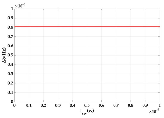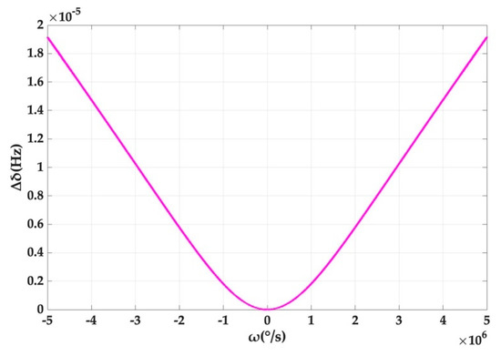 As can be seen from Figure 4, the offset of the system output, induced by Kerr noise, increases with the rotation rate of the cavity and the gradient increases and approximately approaches a constant. However, it should be pointed out that the offset reaches only 1.913 × 10−5 Hz, even if the rotation rate is up to 5 × 106 °/s, which corresponds to the splitting amount of 1.05 × 108 Hz in Figure 3. This is also consistent with the previous result that the offset caused by Kerr noise is small.