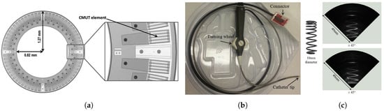 - Moini, A.; Nikoozadeh, A.; Choe, J.W.; Khuri-Yakub, B.T.; Chang, C.; Stephens, D.; Smith, L.S.; Sahn, D. Fabrication, Packaging, and Catheter Assembly of 2D CMUT Arrays for Endoscopic Ultrasound and Cardiac Imaging. In Proceedings of the ASME 2015 International Technical Conference, San Francisco, CA, USA, 6–9 July 2015; p. V003T07A008. [Google Scholar] [CrossRef]