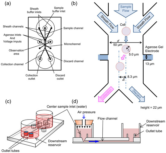 Agarose gel electrodes have several advantages compared with metal electrode arrays. For example, they can generate ion currents and hence prevent bubble formation from electrolysis in the microfluidic flow, even when higher voltages are applied. Our agarose gel electrode cell sorting in a microfluidic chip can be briefly described as follows (Figure 2b) [18,20,44]: (i) a direct ion current pulse is generated by applying a pulsed DC voltage between a pair of agarose gel electrodes, which are designed to contact two side walls of a microfluidic flow channel when a target cell is recognized; (ii) the position of the target cells is shifted from the center of the microfluidic flow due to the electrophoretic force; and (iii) the target cells flow into the collection outlet. In this system, cells were applied to a sample inlet and introduced into the observation area of the microchannel (Figure 2b–d). The flow speed was controlled by the air pressure of the upper stream. The channel width (d) and height were 50 μm and 22 μm, respectively, and the position of cells flowing from the sample inlet was set on the channel center with hydrodynamic focusing of the two side sheath flows. The downstream part of the chip was divided into two channels: a “discard” outlet and a “collection” outlet. When the cells were shifted more than 8.3 μm (Δ) from the center of the channel, cells flowed into the “collection” outlet. Otherwise, all cells were transported to the “discard” outlet. Once a direct current voltage was applied to the agarose gel electrodes (13 μm in width and 22 μm in height), the cells were shifted in the direction of the collection outlet branch by an electrophoretic force.