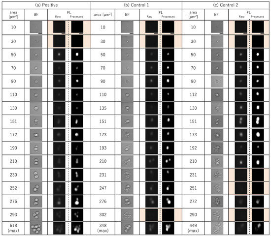 For example, as shown in the orange hatched frames in Figure 3, none of the particles smaller than 30 μm2 in blood had any FL-stained area. Hence, those particles appeared to be microvesicles or large oncosomes. It can also be applied for the identification of debris in larger cell area samples. For example, in positive samples (Figure 3a), even in larger cell clusters, the same numbers of nuclei were observed at the right position of each cell in BF images. However, in both Control 1 and Control 2 (Figure 3b,c, respectively), the estimated number of cells and number of nuclei did not match. Most larger clusters had no nucleus or a single nucleus. This indicates that the larger clusters in Control 1 and 2 were mostly composed of debris.