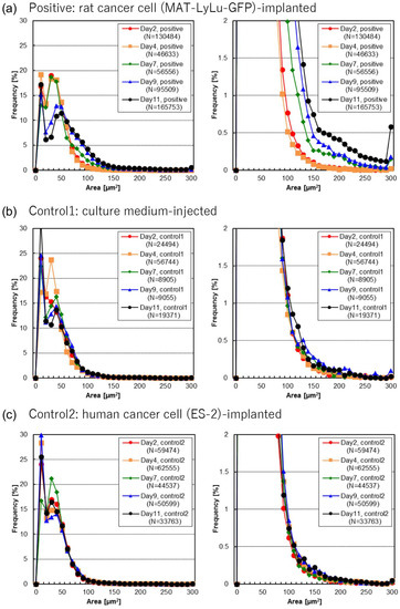 Time-course change of the distribution of total nucleus area in positive (a), control 1 (b), and control 2 (c) blood of the same samples as in Figure 4. Each nucleus area distribution map is from 2, 4, 7, 9, or 11 days after the implantation of rat cancer cells (a, positive), culture medium (b, control 1), or human cancer cells (c, control 2). Measurements were performed for six rats for positive cases and three for controls. The graphs on the right are magnified versions of those on the left.