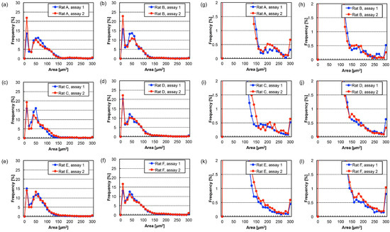 Size distribution of BF cell areas in positive blood from six individual rats 11 days after cancer cell implantation. (a–f) indicate the results for six rats with overlaps of assays performed twice using the same blood samples, to confirm the reproducibility of the measurements; (g–l) are magnified versions of (a–f) to emphasize the frequency values in large cell areas (e.g., (g) is a magnified version of (a)).