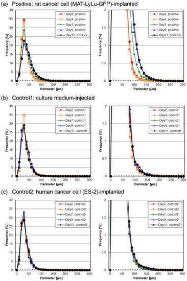 Perimeter length distribution of BF cell areas in positive (a), control 1 (b), and control 2 (c) blood of the same samples as in Figure 4. Each size distribution map indicates 2, 4, 7, 9, or 11 days after the implantation of rat cancer cells (a, positive), culture medium (b, control 1), or human cancer cells (c, control 2). Measurements were performed for six rats for positive blood and three for each control. The perimeter length distribution graphs on the right are magnified graphs of those on the left, to emphasize the details of the time-course changes of frequencies of larger perimeter lengths.