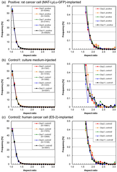 Aspect ratio distribution of BF cell areas in positive (a), control 1 (b), and control 2 (c) blood of the same samples as in Figure 4. Each size distribution map indicates 2, 4, 7, 9, or 11 days after the implantation of rat cancer cells (a, positive), culture medium (b, control 1), or human cancer cells (c, control 2). Measurements were performed for six rats for positive cases and three for the two types of control. The x-axis shows 0.2 intervals, while the y-axis (frequency) value at x = 1 represents the sample population percentage having an aspect ratio of 1 to 1.2. The graphs on the right are magnified versions of those on the left.