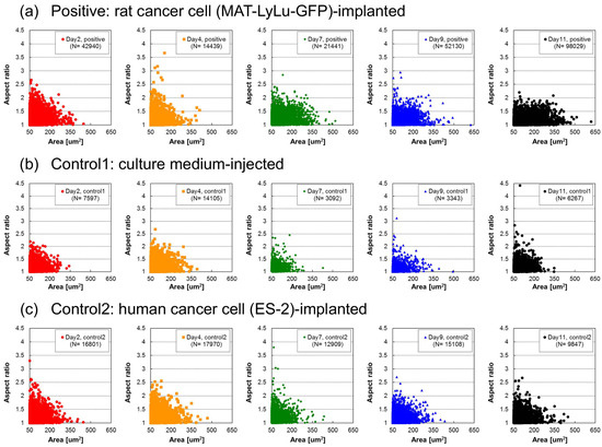 Cell size dependence of aspect ratio distribution of BF cell areas in positive (a), control 1 (b), and control 2 (c) blood of the same samples as in Figure 4. Each distribution graph is from 2, 4, 7, 9, or 11 days after the implantation of rat cancer cells (a, positive), culture medium (b, control 1), or human cancer cells (c, control 2). Measurements were performed for six rats for positive cases and three for controls. Each dot represents the cell size–aspect ratio of each sample.