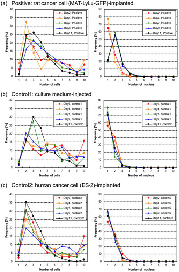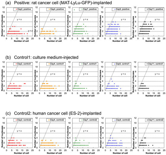 Time-course changes of cell number and nucleus number distribution in positive (a), control 1 (b), and control 2 (c) blood of the same samples as in Figure 4. The cell number–nucleus number distribution map indicates the results for 2, 4, 7, 9, and 11 days after the implantation of rat cancer cells (a, positive), culture medium (b, control 1), or human cancer cells (c, control 2). Measurements were performed for six rats for positive cases and three for controls. The data for each sample are plotted as a dot in the graphs. The dashed line corresponding to represents the relationship of single cell with a single nucleus.