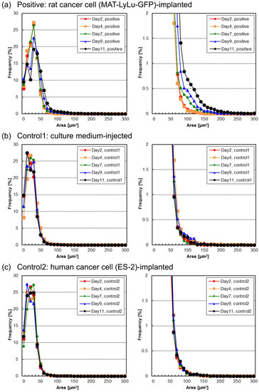 Figure 4 shows the size distribution of BF cell area in blood 2, 4, 7, 9, and 11 days after implantation for positive (Figure 4a), control 1 (Figure 4b), and control 2 blood (Figure 4c). The left graphs present the whole size frequency distributions, while the right ones are magnified graphs enabling observation of the increase of larger cells in more detail.